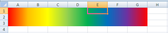 In cell A1 I set the background as a gradient from red on the left to orange on the right. B1 got orange to yellow, C1 got yellow to green, etc.
