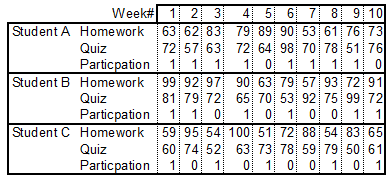 Lastly, you can use borders to easily delineate groups. The example I’ve shown here is for students who have a variety of grades every week, but it’s helpful for almost any kind of statistic where breaking it up into logical groups like this could make it easier to read by making it all fit on a single page. Financially it could be used to track the historical annual high and lows of a number of stocks or mutual funds — the fund name would be where the student name is, you’d have high and low instead of homework/quiz/participation, and you’d have years instead of week. A third possible use of this format is displaying teaching statistics per month & teacher or topic in libraries. You could have the teacher’s name or topic where the student name currently is, then undergraduate/graduate/staff taught, and the columns would be the months. Really, the possible permutations are endless, and all depend on your needs.